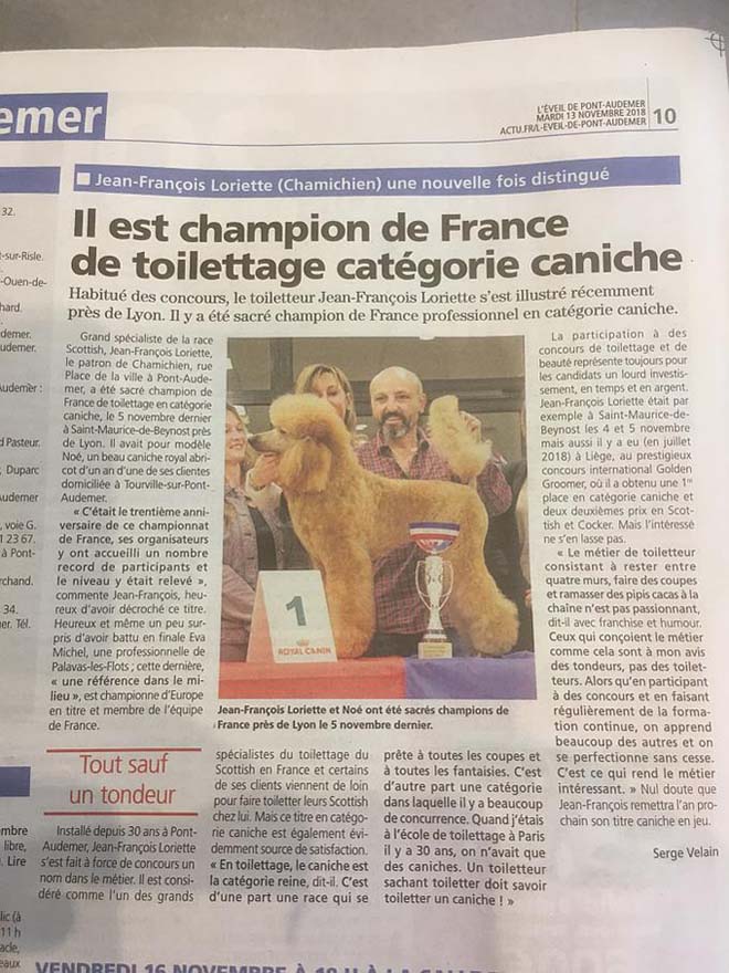 Son palmarès parle pour lui, champion de France de toilettage catégorie caniche, détenteur du premier prix du Golden Groomer à Liège en 2016, c’est le meilleur toiletteur à proximité de Pont-Audemer, Bourg, Les Achards, Beuzeville, Brionne, Lillebonne et Pont-l’Évêque, connu et reconnu pour son talent de toiletteur professionnel et sa maîtrise de l’épilation pour chien.